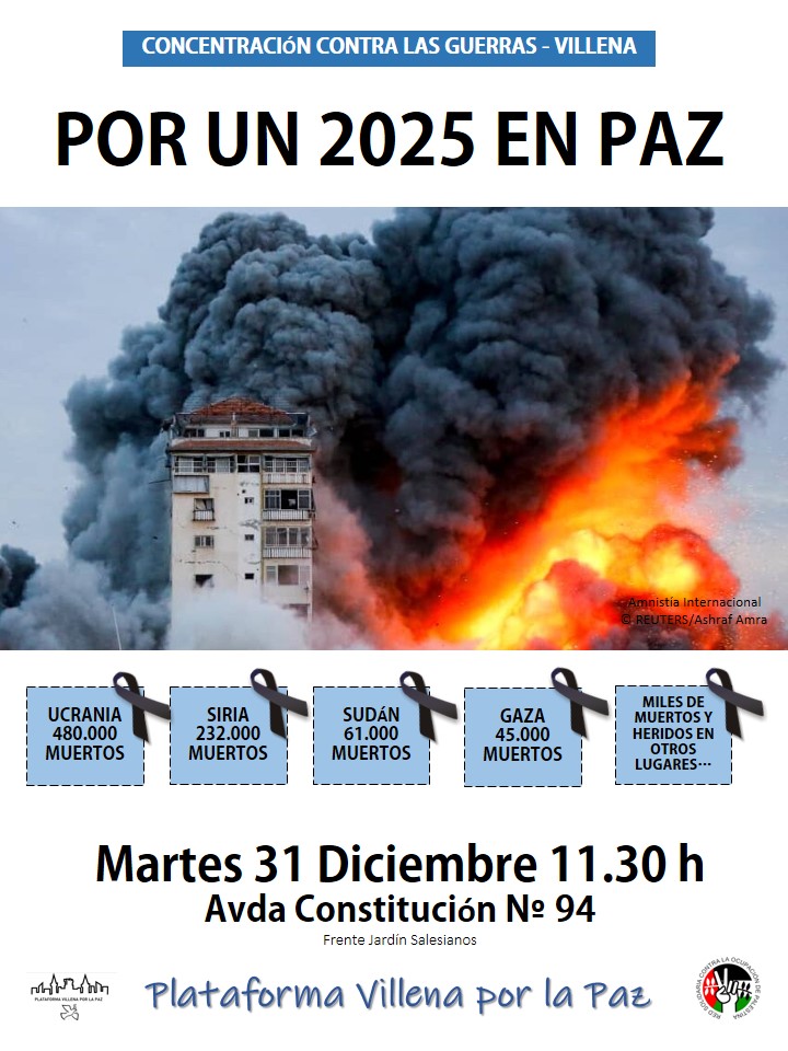 Coincidiendo con el fin de año y el inicio del Año Nuevo, la Plataforma Villena por la Paz convoca una nueva concentración contra la guerra. En esta ocasión la plataforma pacifista quiere ampliar su denuncia a los más de 30 conflictos armados vigentes en el mundo elevando una voz por el fin de las guerras para el año entrante. Junto a la oposición a la guerra en Gaza y Ucrania, se pretende alzar la voz contra las guerras en Yemen, Sudán, Etiopía, Somalia, Nigeria, Burkina Fasso, Myanmar, Congo, Siria y tantos otros lugares en los que la violencia destroza la vida de millones de personas.