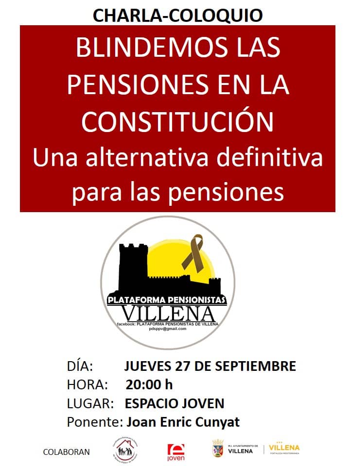 La plataforma por la defensa del sistema público de pensiones os invita esta tarde a la charla coloquio que tendrá lugar en el Espacio Joven a las 8 de la tarde en la que hablaremos de la necesidad de Blindar las Pensiones.