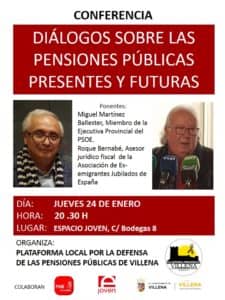 La Plataforma Local por la Defensa de las Pensiones Públicas de Villena ha organizado una nueva charla informativa que tendrá lugar el jueves 24 de enero a las 20.30 horas en el Espacio Joven.