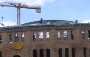 Pues bien, la plaza de toros es un gran juego de playmobil, en el que podemos ver cascos de diferentes colores: los hay blancos, verdes, rojos; todo un repertorio de monos que los empleados llevan y que se distinguen según la empresa a la que pertenezcan; hay trabajadores intrépidos que deambulan colgados con sus arneses, otros manipulan el mecanismo que hace funcionar las inmensas grúas que coronan el edificio; toda una hilera de albañiles van y vienen, entran y salen de entre los tendidos o de las innumerables zanjas que cicatrizan la obra; es digno de ver la maraña de pequeñas excavadoras y no tan pequeñas, volquetes, camiones-grúa, otras grúas de otro tamaño que hacen volar a los operarios en la fachada; cristales que vuelan y se acoplan al techo de vidrio que cubre la plaza; un sinfín de tubos y demás cables que están enterrados o en proceso; el capataz que supervisa y pone en solfa todo el tinglado, el jefe de obra o quien sea que manda más que nadie y que se distingue por su indumentaria algo más fina; el reflejo de la soldadura en el techo y aledaños; el tremendo edificio piramidal anexo en el que las paredes-espejos puede que reflejen las caras de los vecinos; en fin, y para acabar de completar el playmobil, la avenida de la Constitución es el toque definitivo. Un ir y venir de camiones, excavadoras, tuberías, arena por doquier y la apisonadora con su empleado-playmobil conduciéndola, una gran cantidad de protectores rojo-blancos que delimitan el tráfico rodado de la obra; aceras estranguladas por las vallas y la pared, donde los coches de bebés son un peligro; planchas de hierro que salvan alguna cochera… y Mercadona (que merecería un playmobil especial aparte). Tenemos en este juego maravilloso, digno de los Reyes Magos y que cualquier niño soñaría, las tiendas de alrededor, los bares, fruterías… ¡Qué espectáculo que se nos ofrece gratuitamente a la ciudadanía!. Incluso, para que no falte de nada, también hemos cambiado unos playmoboil-villena por otros playmobil-biar, y es que este juego es creativo, podemos quitar y poner.