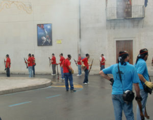 La pólvora de los casi 400 arcabuces que participaron en este acto inundó la ciudad. Tras los arcabuceros y capitanes de las 14 comparsas que forman las fiestas de Moros y Cristianos, las autoridades locales, la alcaldesa, Celia Lledó, acompañada de varios concejales, las autoridades festeras, al frente el presidente de la Junta Central de Fiestas, Manuel Muñoz, Regidoras, Madrinas, y alféreces con las banderas y la Banda Municipal de Música recorrían las calles de la ciudad.