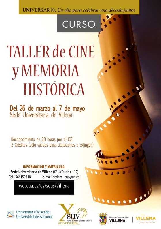 La Sede Universitaria de Villena oferta un taller de Cine y Memoria Histórica con un total de 20 horas de clases repartidas en cinco sesiones. Las clases se impartirán en horario vespertino, desde las 5 de la tarde hasta las 9 de la noche. El curso comienza el próximo jueves 26 de marzo y finaliza el 7 de mayo.