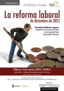La Conferencia con título “La reforma laboral de diciembre de 2021”, será el día 3 de marzo de 2022, a las 19.00 h, en la Sede Universitaria de Villena, en La Tercia.
