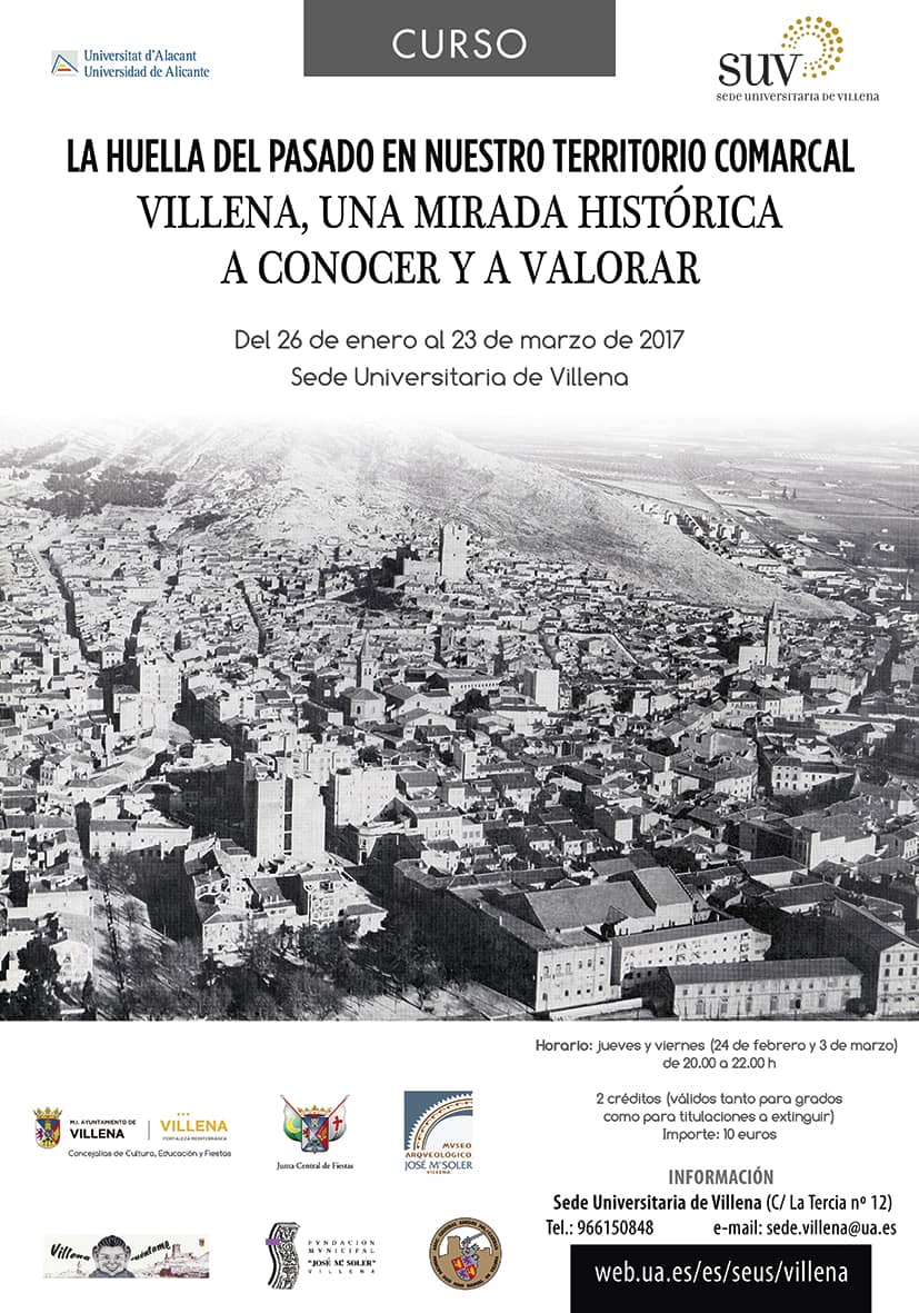 La Sede Universitaria de Villena (c/ La Tercia, 12) acogerá desde el 26 enero hasta el 23 de marzo el curso “La huella del pasado en nuestro territorio comarcal. Villena, una mirada histórica a conocer y a valorar”. Un encuentro que tendrá como objetivo dar a conocer y difundir la historia local y comarcal de algunos de los territorios de la provincia de Alicante, además de ofrecer la oportunidad de enriquecer la historia de Villena.