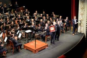 Al inicio de la segunda parte se hizo un sentido y merecido homenaje a un músico fundador de la Sociedad que se ha encargado durante más de 20 años en poner en marcha y coordinar la Escuela de Música. Nos estamos refiriendo a Bernardo Mejías Maestre. Esta persona ha sabido transmitir los valores que llevan las formaciones bandísticas junto con la coordinación pedagógica y tareas de ejecución de la Escuela. Se le entregó un cuadro y a su esposa un ramo de flores.