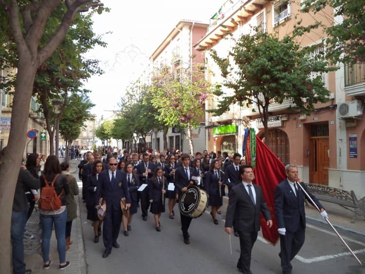La tarde se inició recibiendo a las bandas participantes en la puerta del Ayuntamiento y colocando un corbatín de recuerdo a las banderas. A continuación la Sociedad Musical interpretó el pasodoble “Pedro y Juan Bautista “, del recordado compositor Pedro J. Francés Sanjuán, por las calles de Elda hasta llegar a la puerta del Teatro.