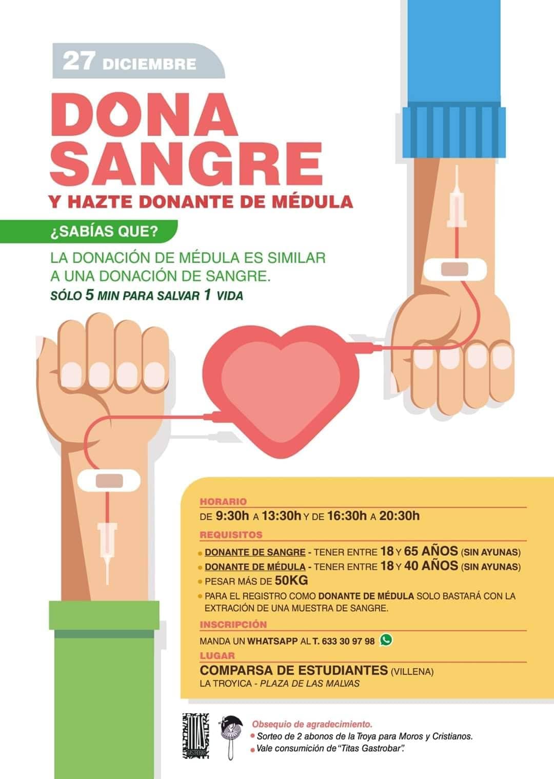 Os informamos de la próxima donación en Villena, será el próximo día 27 de diciembre, en comparsa de Estudiantes La Troyica, en horario de 9,30 a 13,30 y de 16,30 a 20,30.