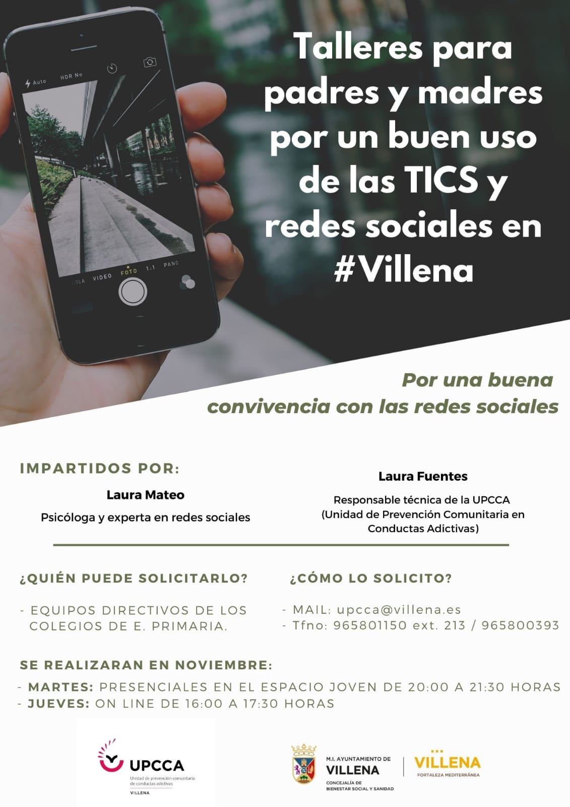 La Unidad de Prevención Comunitaria de Conductas Adictivas (UPCCA) de Villena ha ofrecido a los centros escolares de primaria un taller de formación destinado a padres y madres sobre el uso responsable de las redes sociales. La pretensión de la UPCCA es ofrecer claves didácticas para los adultos en materia de control de las nuevas tecnologías y las diferentes plataformas sociales que eviten la sobreexposición de los menores, la dependencia a las mismas u otros posibles abusos, así como sus efectos negativos.