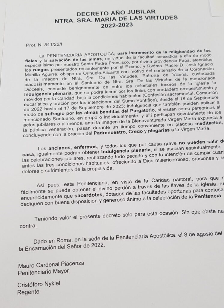 El Año Jubilar comenzará el 18 de septiembre en el santuario con la apertura de la puerta santa a las 11.15 horas por parte del Obispo de la Diócesis Orihuela- Alicante, José Ignacio Munilla. El traspaso de la misma durante este año supondrá obtener de Roma la indulgencia plenaria si se realizan una serie de actos como la confesión o la eucaristia.