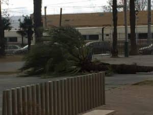 Las rachas de viento han llegado a alcanzar en Villena los 82 kilómetros hora, según el observatorio meteorólogico del Camino de San Juan. El fuerte temporal ha provocado numerosas caídas de árboles tanto en el paseo Chapí como en la Plaza de Las Malvas como en el polideportivo municipal. También el campanario de la iglesia de Santiago aparecía con un reloj menos. Los bomberos han tenido que atender a numerosas llamadas para despejar caminos rurales.