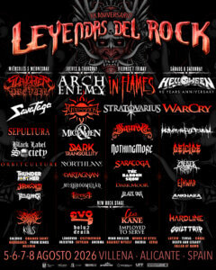 El XX aniversario de Leyendas del Rock se celebrará los días 5, 6, 7 y 8 de agosto, en Villena, Alicante, España, y supone el cartel más espectacular y ambicioso del veterano festival de heavy metal en toda su dilatada historia. Helloween, In Flames, Arch Enemy, Slaughter To Prevail, Savatage, Godsmack, Warcry, Sepultura, Black Label Society, Saurom, entre otras muchas propuestas, encabezan la atractiva y variada oferta para 2026.