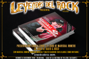 Dentro del marco Leyendas del Rock, tenemos por delante una velada única en la que contaremos con una charla-presentación del libro, llevada a cabo por el propio Mariskal Romero y el periodista Mariano Muniesa (co-autor del trabajo), Marcos Rubio (organizador de Leyendas del Rock) como moderador y la presencia de Walter Giardino (Rata Blanca) y José Luís Campuzano “Sherpa” (cantante y bajista original de Barón Rojo), quien ofrecerá un set acústico a la conclusión del coloquio.