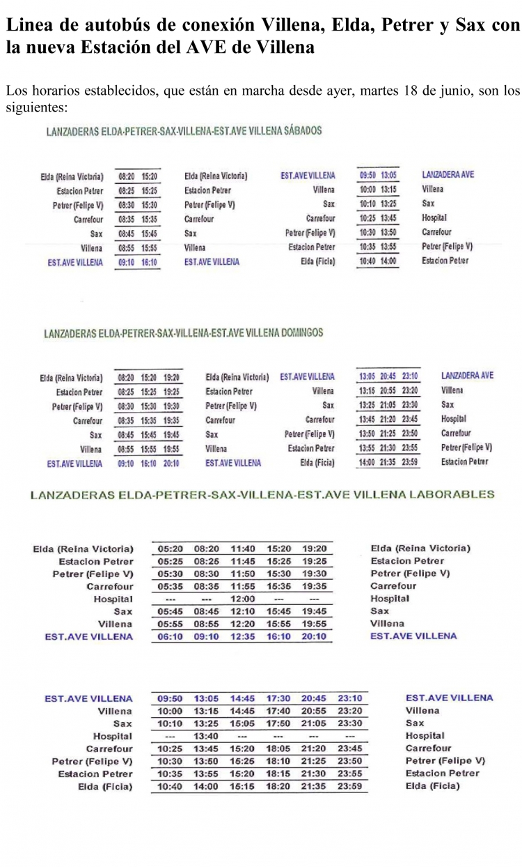 El Ayuntamiento de Villena informa que se ha puesto en marcha un servicio de conexión mediante autobús entre los municipios de Villena, Elda, Petrer, Sax y la nueva estación de AVE de Villena a través de la empresa Subus Vectalia.