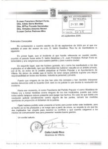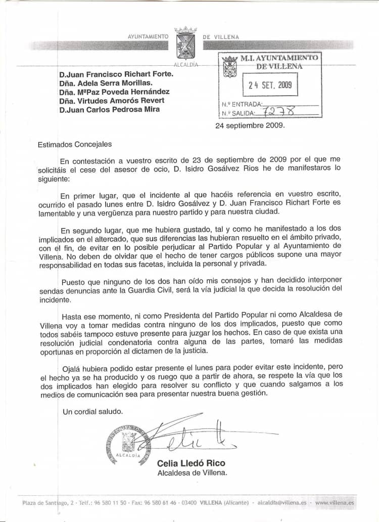 Como ya anunció la alcaldesa, Celia Lledó, ayer deja en manos de los tribunales la resolución de la pelea entre su asedor de Ocio, Isidro Gosálvez y el concejal de Obras Juan Richart. En una carta dirigida a los cinco concejales que pidieron el cese de Gosálvez (Juan Richart, Mª Paz Poveda, Adela Serra, Virtudes Amorós y Juan Carlos Pedrosa) les indica que “de momento, ni como Presidenta del Partido Popular ni como Alcaldesa de Villena voy a tomar medidas contra ninguno de los dos implicados, puesto que como todos sabeis tampoco estuve presente para juzgar los hechos. En caso de que exista una resolución judicial condenatoria contra alguna de las partes, tomaré las medidas oportunas en proporción al dictamen de la justicia”.