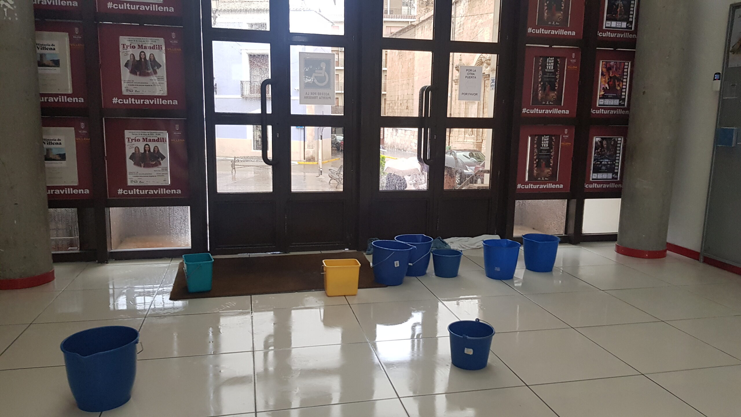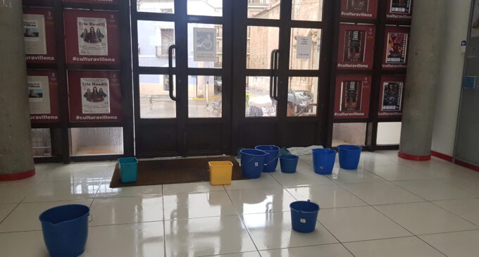 Las goteras han vuelto a aparecer en la Casa de la Cultura de Villena. En época de lluvias persistentes las filtraciones de aguas y las goteras son un continuo en este inmueble.