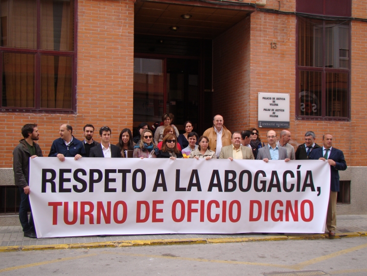 Los abogados del turno de oficio de Villena han secundado hoy un paro por los impagos de la Conselleria. Asimismo, a las doce de la mañana, se han concentrado en la entrada de los juzgados locales con una pancarta en la que se podía leer “Respeto a la abogacía, turno de oficio digno”.