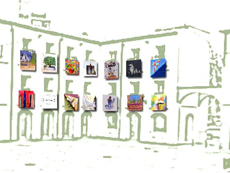 La exposición esta compuesta de 18 telas pintadas por los distintos miembros de CLAM – ART, que colgaran de los balcones del Edificio situado en la Plaza Mayor.