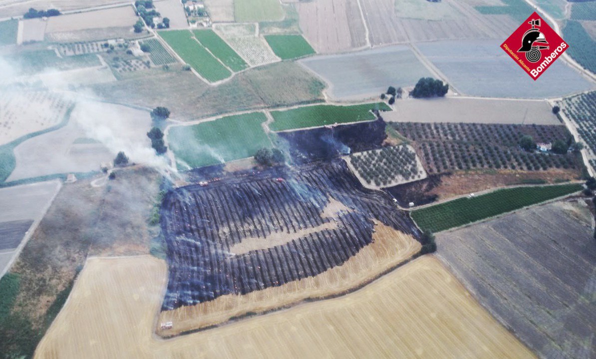 A las 16:44 horas se iniciaba un fuego en el camino de San Juan en Villena. Los bomberos han sofocado el mismo que ha afectado una amplia zona de cultivo, rastrojos de siembra y balas de paja.