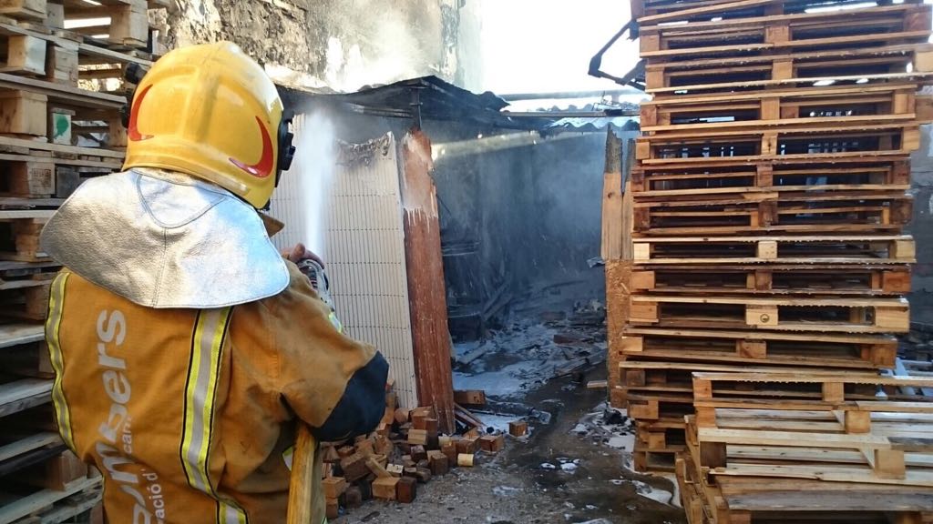 Los bomberos sofocan el fuego de varios palés agrupados en un patio de la calle La Rambla
