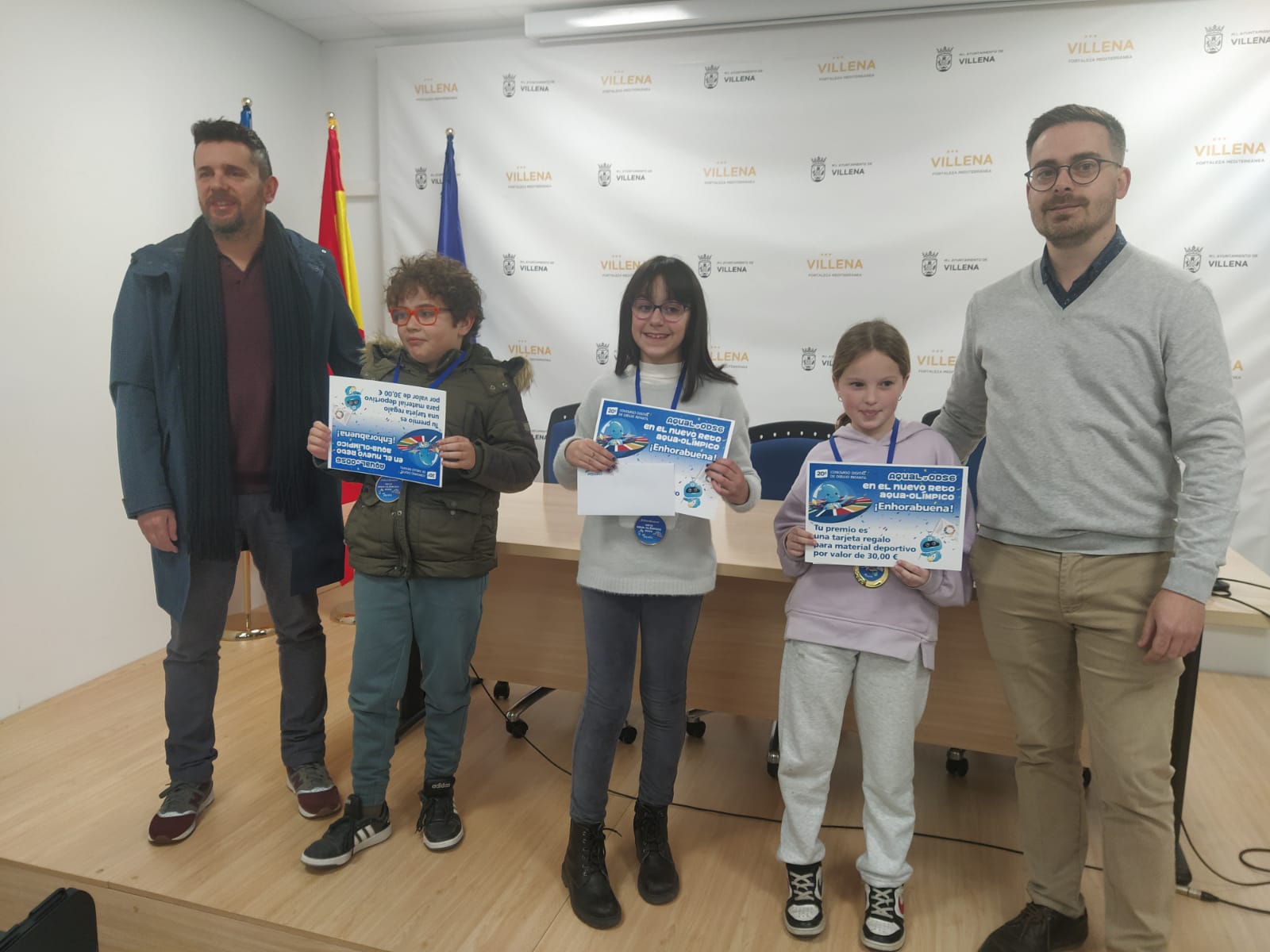 El concejal de Ciclo del Agua, Francisco Iniesta, acompañado por el responsable de Aqualia en el municipio, Gabriel Morales, han entregado a Jacobo Mira Muñoz del CEIP El Grec, Fabiola del Rey Sáez de Salesianos Villena y Sofía Flor Domene de La Celada, sus premios por haber resultado finalistas del concurso convocado a nivel nacional, consistente en una tarjeta para material deportivo de 30 € para cada uno.