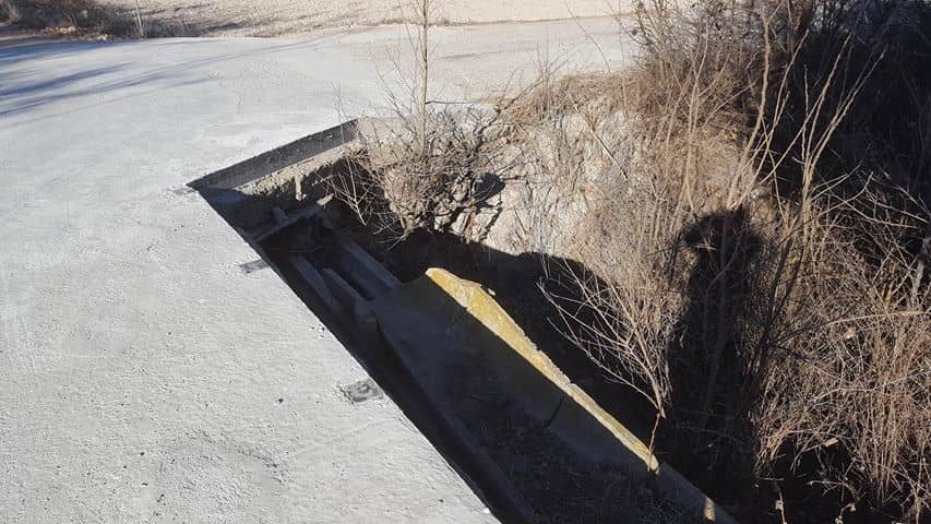 Una de las curvas del camino de San Juan en Villena contaba durante años con un socavón de grandes dimensiones, un peligro para los caminantes y especialmente por la noche, ya que el paraje carece de iluminación y los vehículos podrían caerse en la acequia colindante.