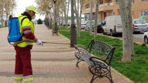 Con desinfectantes están limpiado el mobiliario urbano y las barandillas de los centros de salud así como baldeando las calles. La máquina de baldeo se va a trasladar a las pedanias como Las Virtudes o La Encina antes de que finalice la semana.