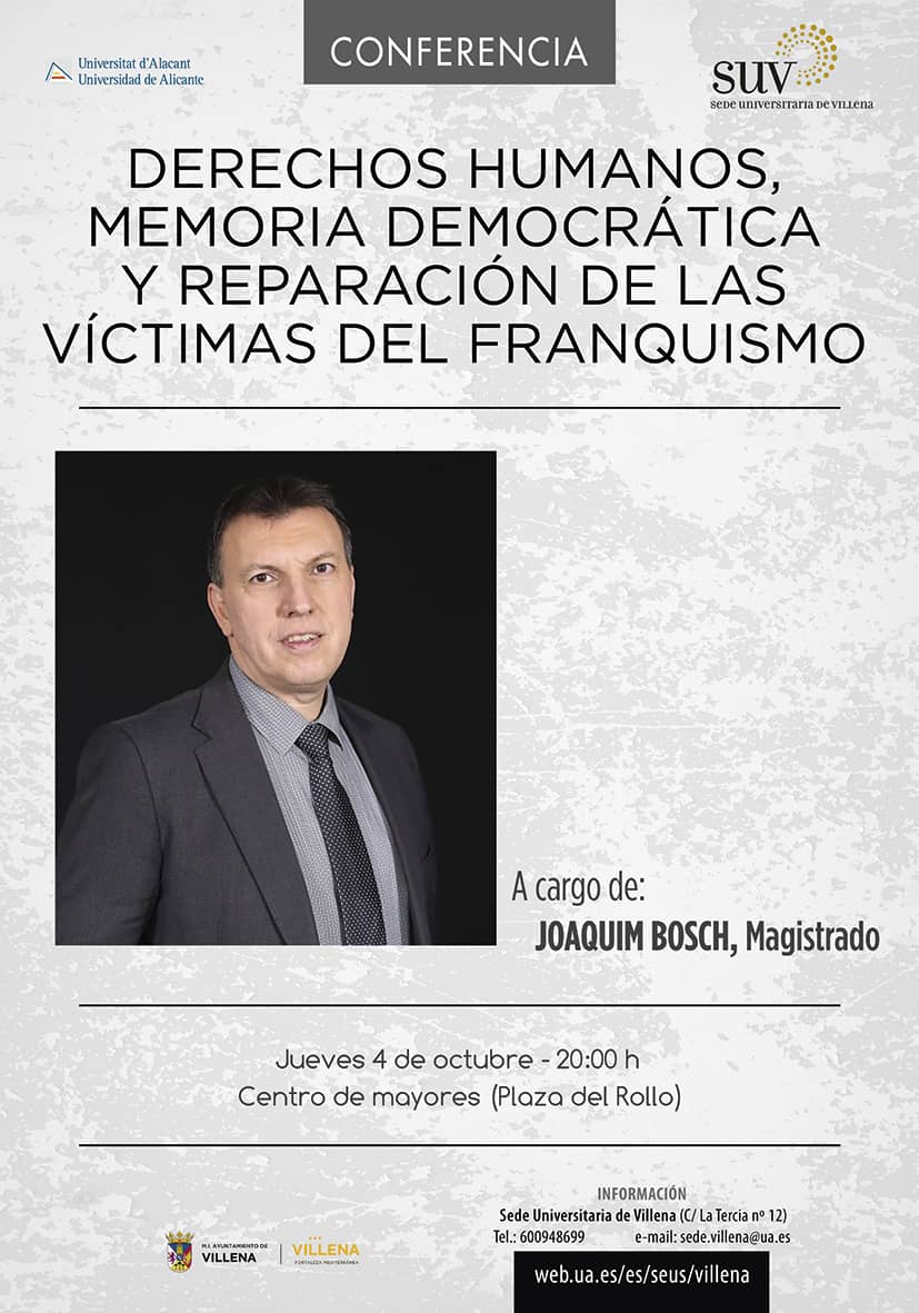 La Sede Universitaria de Villena de la Universidad de Alicante organiza la conferencia “Derechos Humanos, memoria democrática y reparación de las víctimas del franquismo”, cargo del magistrado Joaquim Bosch. El acto tendrá lugar mañana jueves 4 de octubre en el Centro de Mayores (Plaza del Rollo) a las 20 horas.