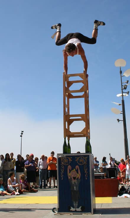 Una exhibición de acrobacias y equilibrios, ejecutados sobre un fondo musical con: juegos de bolas, paseos en bicicletas mínimas, torres de sillas cuyo precario equilibrio nos hace contener la respiración… en definitiva una propuesta muy entretenida, entrañable por la ternura de su protagonista, y participativa para el disfrute de niños y mayores.