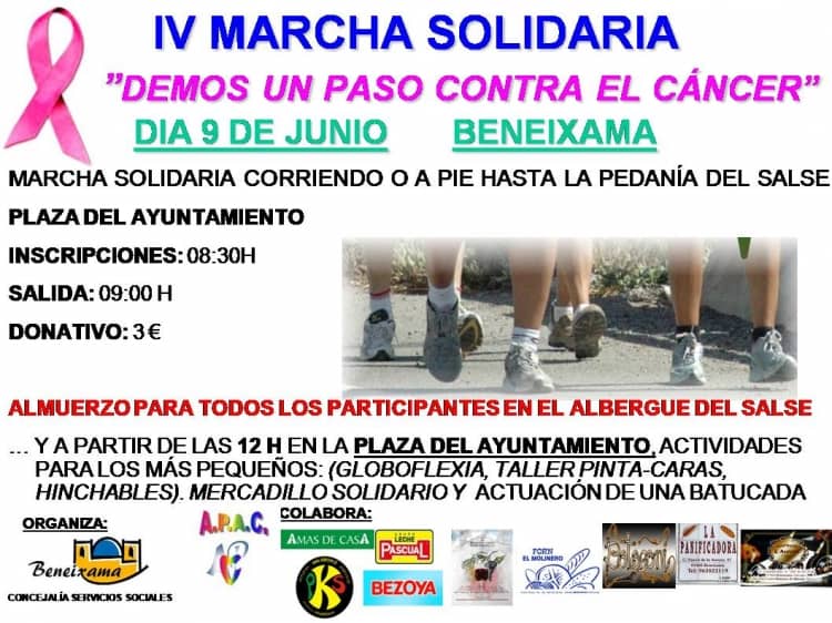 El próximo domingo 9 de junio de 2013, la concejalía de Servicios Sociales del Ayuntamiento de Beneixama ha organizado una marcha solidaria contra el cáncer corriendo o a pie hasta la pedanía del Salse.
