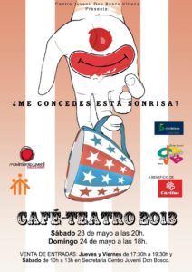 Un momento en el que los monitores del Centro Juvenil se comprometen con la sociedad de Villena, pero sobre todo con los más necesitados. Cada año, el beneficio del CAFÉ TEATRO, está destinado a una asociación de nuestra ciudad. Este año, será a beneficio de CÁRITAS.