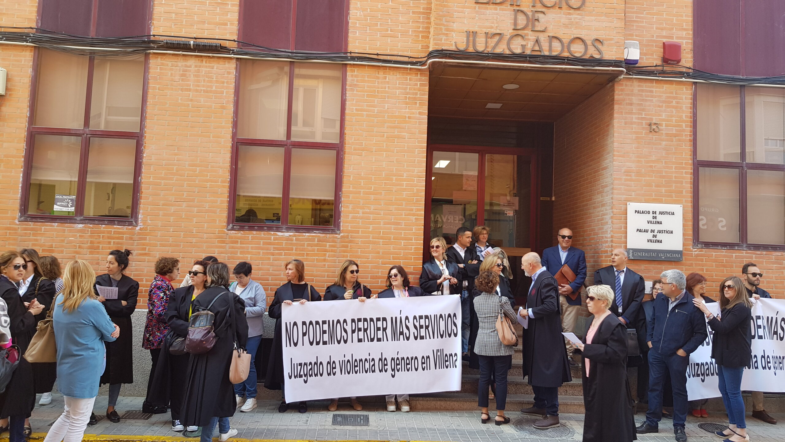 Medio centenar de abogados, ciudadanos y políticos locales se han concentrado esta mañana a las puertas de los Juzgados de Villena para pedir a Conselleria mantenga el juzgado de violencia de género en la localidad y evitar que se traslade a Elda, como tiene previsto la administración autonómica.