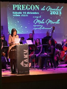 Mila Murillo, acompañada de la Sociedad Musical Ruperto Chapí, abrió los actos de Navidad con su pregón sobre el escenario del Salón de Actos de la Casa de la Cultura en la que glosó sus sentimientos y experiencias personales de estos días del año tan especiales. La empresaria y cooperante internacional emocionó al público con su Pregón de Navidad, una intervención que sirvió de preludio a la inauguración oficial del Belén Monumental, que conmemoraba el 50 aniversario de la Asociación de Belenistas de Villena.