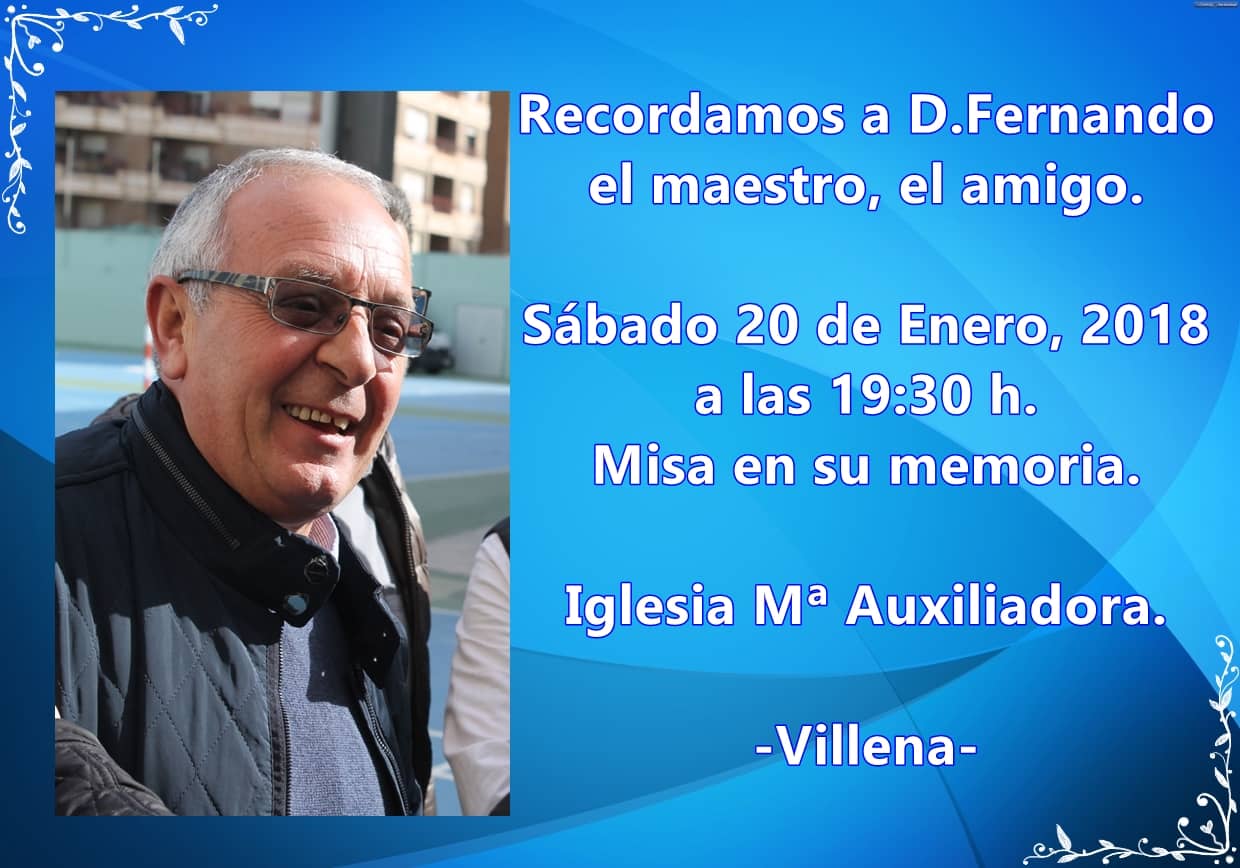 Al mes del fallecimiento de D. Fernando Domene Albero, quien fuera maestro del Colegio de Los Salesianos de Villena y persona implicada con la sociedad villenense, la comunidad salesiana, ofrecerá una Misa en su recuerdo.