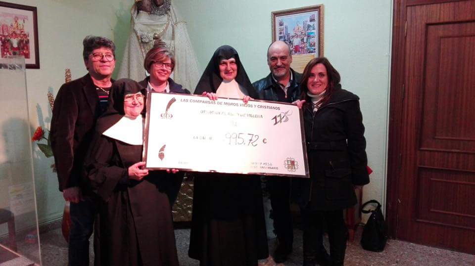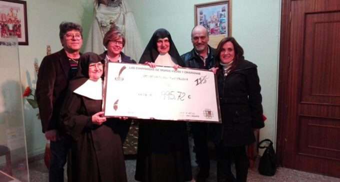 Los presidentes de las comparsas de Moros Viejos y Cristianos, Benigno Aroca y Plácido Galvañ entregaron ayer a las Hermanas del Asilo de los Ancianos de Villena varios cheques y dinero en metálico por valor de 995,72 euros. Esta cantidad corresponde al beneficio del almuerzo solidario que organizaron las dos entidades festeras así como la recaudación de la misa de campaña dedicada a los difuntos. Actos éstos, que Moros Viejos y Cristianos celebraron como inició de sus 175 años en las fiestas patronales.