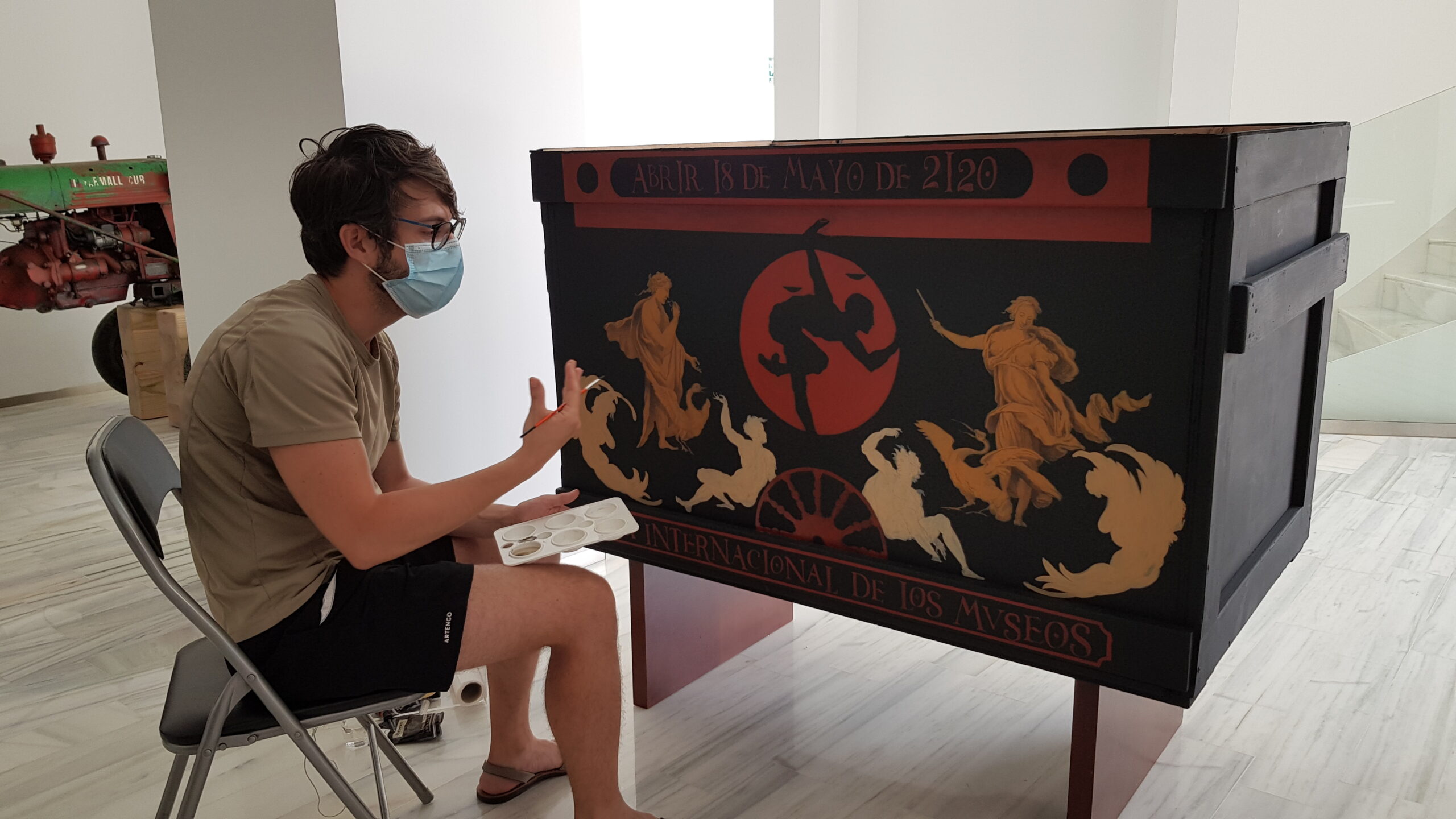 La caja de madera de 1,20 x 80 centímetros que sirvió de traslado del Tesoro de Villena a Madrid en 1991 está siendo decorada por el artista aragonés afincado en Villena, Juan Monzón Gasca, para convertirse en la Cápsula del Tiempo. «Está haciendo una obra de arte, de incalculable valor. Un regalo de Monzón a la ciudad de Villena y que se va a quedar como una pieza más del Museo», explica la directora del Museo, Laura Hernández Alcaraz.