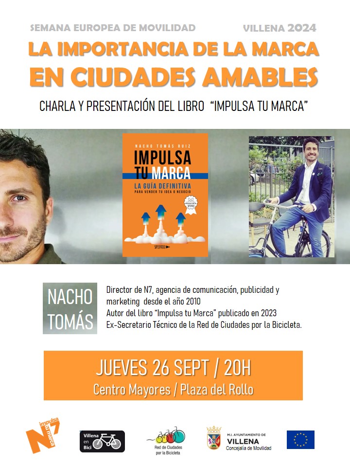 Para todo ello, son necesarias acciones que tiendan a divulgar, comunicar y hacer crecer una serie de consignas y valores en la ciudadanía, bajo una idea de marca. Tomar ejemplos inspiradores de otras ciudades y comunidades, y desde nuestra singularidad, construir una tendencia hacia una ciudad que sea acogedora, transitable, silenciosa, accesible, limpia, bella, en definitiva amable. De todo ello, y mucho más, nos hablará Nacho Tomás, desde su experiencia en N7, así como de su trayectoria en la Red de Ciudades por la Bicicleta de la que Villena forma parte.
