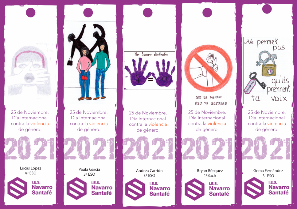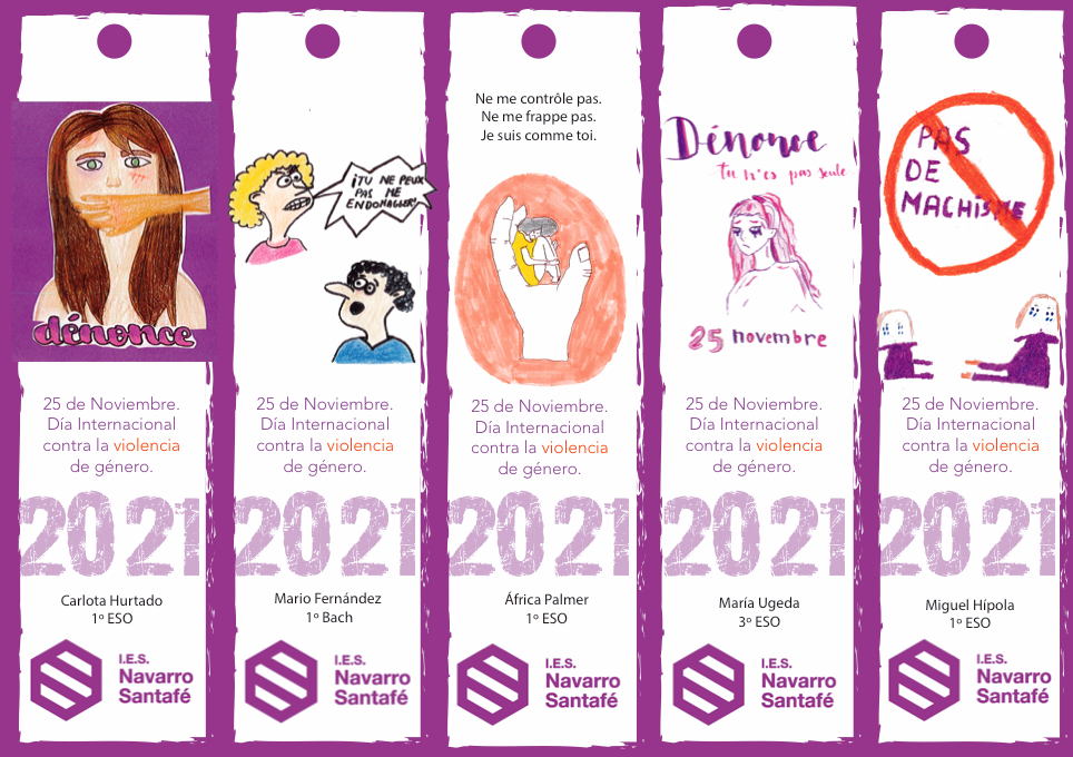 Nuestro instituto ha estado promoviendo, durante este último mes y de modo transversal, una reflexión crítica en torno al problema de la violencia de género. En los pasillos del instituto puede verse una exposición de los diseños de marcapáginas, que ha hecho el alumnado de francés y de educación plástica, con motivos alusivos a esta problemática; así como una serie de infografías sobre la violencia de género en el contexto de las redes sociales.