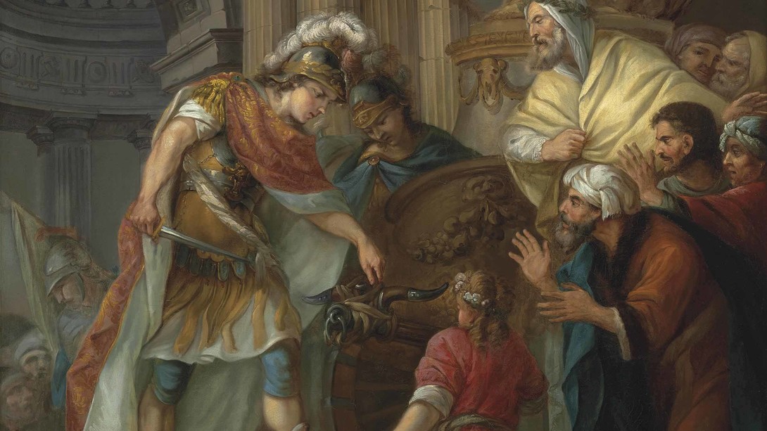 Cuando Alejandro Magno […] se dirigía a conquistar el Imperio persa, tras cruzar el Heloponeso, conquistó Frigia, donde le enfrentaron al reto de desatar el nudo. Solucionó el problema cortándolo con su espada, diciendo: «Es lo mismo cortarlo que desatarlo». Esa noche hubo una tormenta de rayos que simbolizó, según Alejandro, que Zeus estaba de acuerdo con la solución. […]