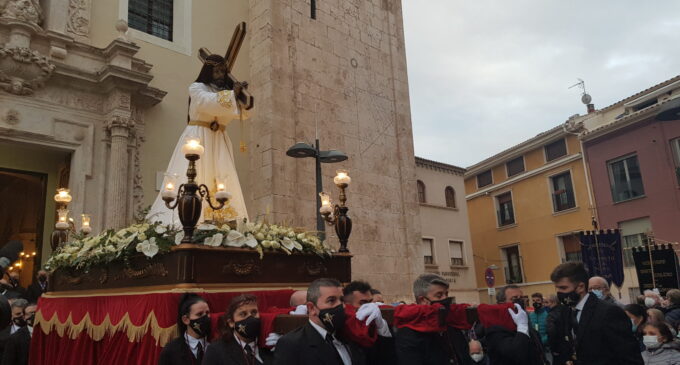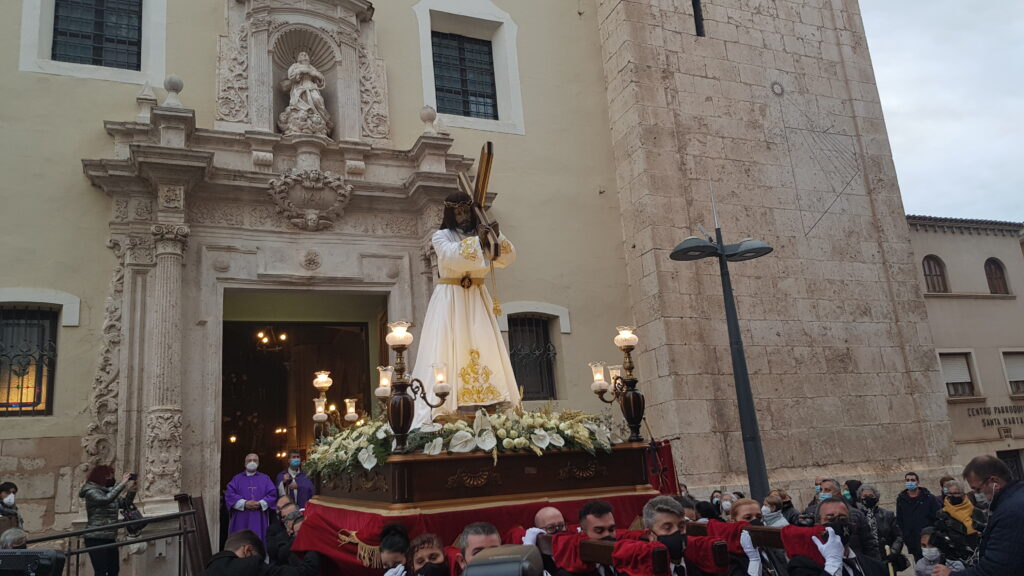 Nuestro Padre Jesús a las 17.15 iniciaba su paseo extraordinario por las calles de Villena con motivo del 75 aniversario de la Cofradía. Un centenar de personas esperaban la salida de la imagen a las puertas de Santa María pese al frío. Portado a hombros, Nuestro Padre Jesús lucía por primera vez la túnica blanca con bordados en oro que se ha elaborado con motivo del aniversario.