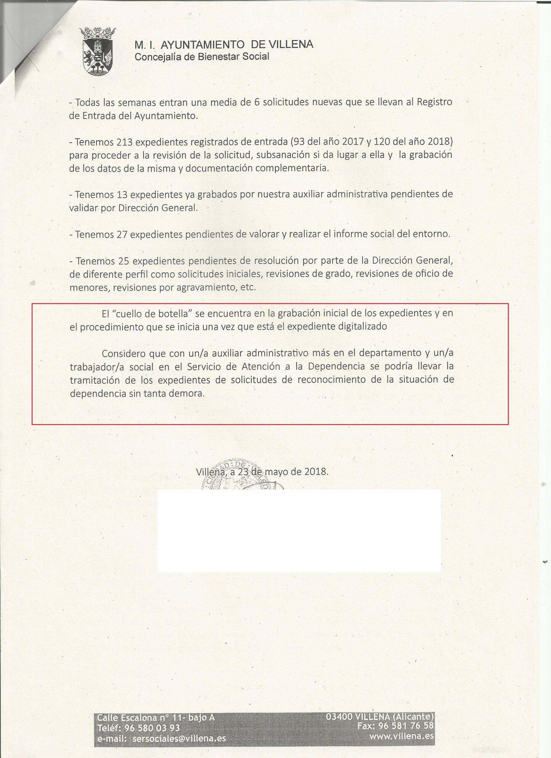 La paralización de los trámites de los expedientes no es algo que sostenga solo el PSOE, sino que también lo afirman con preocupación los propios servicios técnicos municipales. Los mismos profesionales que ayer se reunieron con la vicepresidenta del Gobierno valenciano y quienes han reflejado en un informe la situación de la dependencia en Villena y su comarca. En ese documento, fechado hace escasamente un mes, se advierte que hay 213 expedientes por tramitar y otros 65 ya en fase de tramitación. Pero paralizados en diferentes procedimientos son 278 y no 221 como afirmaba el concejal. Asimismo, en el mismo informe se aborda el descontrol con el que ha manejado la Conselleria este asunto.