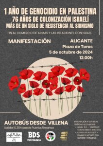 La Plataforma Villena por la Paz continúa reivindicando un alto el fuego, el fin de la ocupación y el fin del comercio de armas con Israel y por eso se suma a la manifestación que tendrá que el lugar en Alicante el próximo día 5 en protesta por la actuación criminal de las Fuerzas de Defensa de Israel.
