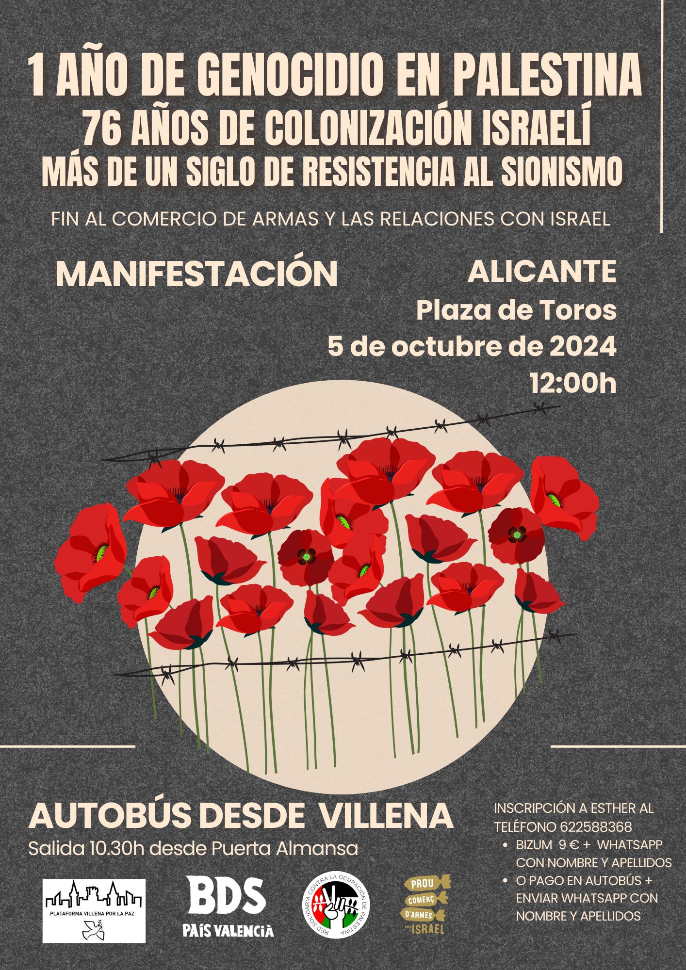 La Plataforma Villena por la Paz pondrá un autobús para acudir a la misma el próximo sábado 5 de Octubre. Las personas interesadas pueden reservar su plaza enviando un whatsapp a Esther, al número 622588368. Nombre y apellidos + Bizum 9 €.