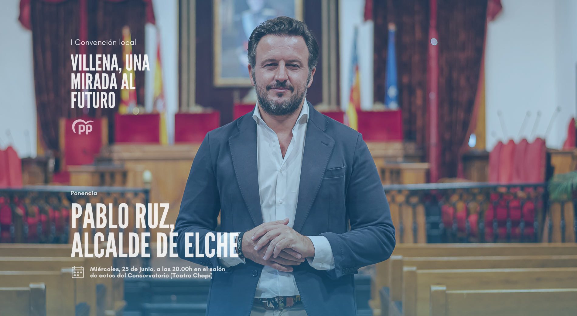El alcalde de Elche, Pablo Ruz, participará en el acto que el Partido Popular de Villena realizará el próximo miércoles 25 de junio, a las 20.00h, en el salón de actos del Conservatorio (en uno de los laterales del Teatro Chapí).