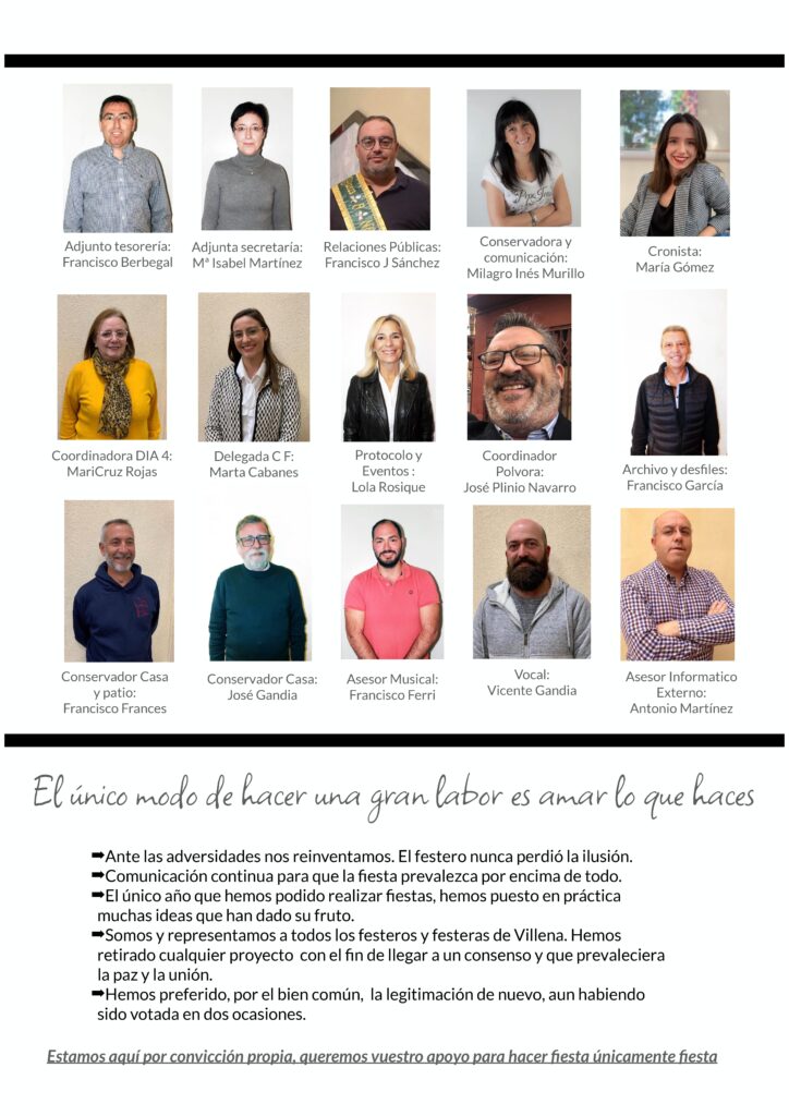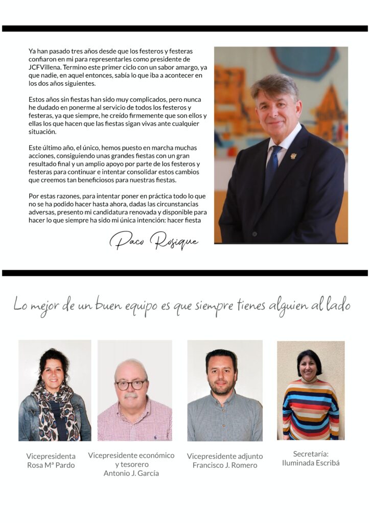 La directiva que le acompañará en los próximos tres años, en el caso de que la asamblea de compromisarios, le de su confianza es en un 70% las misma que hace unas semanas cesó. Alguna cara nueva se ve en el listado de festeros que le acompañan. Rosique medirá sus fuerzas previsiblemente con otras dos candidaturas, que están presentando sus posiciones a las comparsas. De momento, ninguna se ha hecho efectiva en la Casa del Festero.