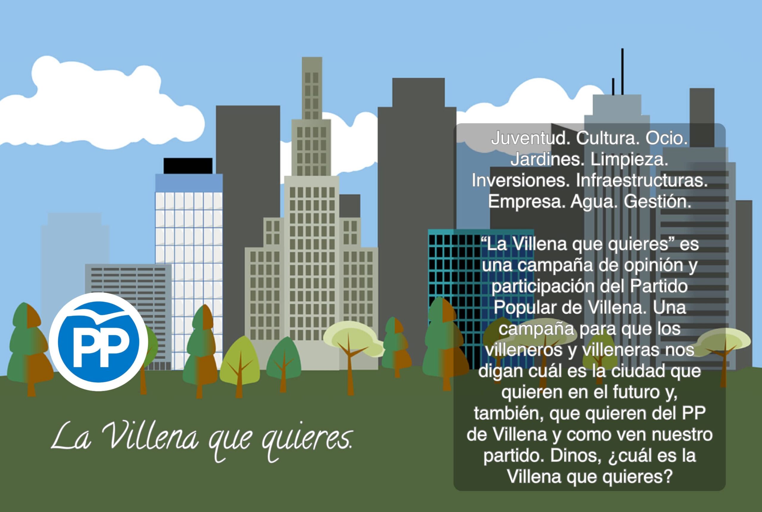 Esta ocasión se trata de una campaña de opinión y participación dirigida no solo a sus afiliados y simpatizantes, sino a toda la ciudadanía de Villena, sean de la ideología que sean; los populares también quieren conocer su opinión y propuestas a través de 30 preguntas. Se pretende con esta acción que los villeneros digan qué Villena quieren, y se pronuncien acerca de diversos temas, entre otros: cultura, ocio, parques y jardines, calles, limpieza, agua, fiestas, pedanías, empresa, patrimonio, aparcamiento, infraestructuras; en fin, temas variados.