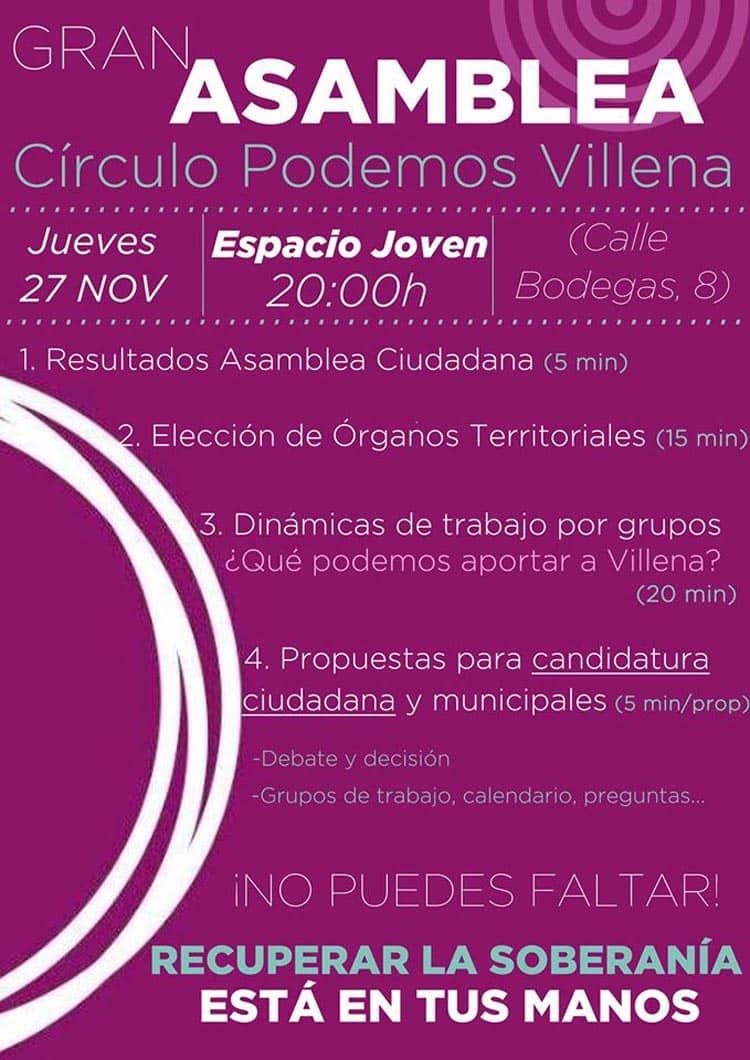 El Círculo Podemos Villena te invita a la “Gran Asamblea” que se celebrará el día 27 de Noviembre a las 20:00h en el Espacio Joven de Villena.