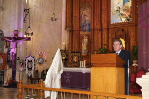 El presidente de la Junta Mayor de Cofradías y Hermandades, Manolo Coloma fue el encargado de dar paso al pregonero 2019. Sobre él destacó que cumple con los requisitos exigidos como son “humildad, honestidad y compromiso”. Recordó que Ramón Martínez participa activamente en las cofradías del Ecce Homo y el Cristo de las Penas, de la cual forma parte desde sus inicios, tras la Guerra Civil, en los años 40.