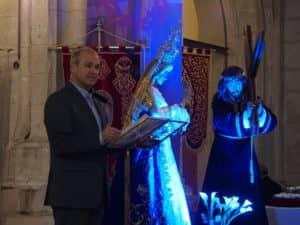 El acto se celebró, tras la Santa Misa celebrada a las 19 horas, en una abarrotada iglesia de Santa María. Esquembre, recién aterrizado tras su participación en el Congreso Internacional de Comercio de Buenos Aires, destacó su involucración con la Semana Santa desde su niñez. “Tengo el recuerdo de las tardes de jueves o viernes en la calle de Santa María hasta Santiago ensimismado con el redoble de los tambores y las cornetas”, pronunció Esquembre.