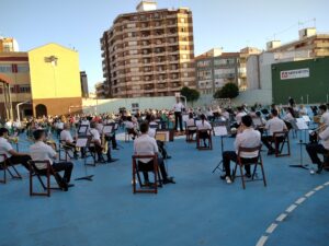 Este viernes pasado, 14 de agosto 2020, la Sociedad Musical Ruperto Chapí volvió a sus atriles, después del confinamiento, y mostró lo que sabe hacer muy bien: interpretar buena música. Y lo hice al aire libre, en el patio del Colegio de los Salesianos a las 20 horas.