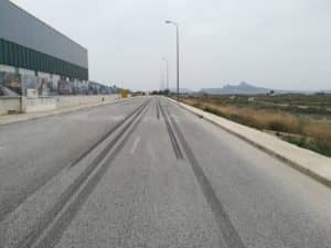 En los últimos meses hemos ido observando en el polígono de Bulilla huellas de derrapes y frenadas en la calzada, marcas que se han ido incrementando sensiblemente con el paso del tiempo. También se puede ver que varias farolas del polígono así como alguna señal de tráfico están dobladas lo que puede provocar que alguna de ellas caiga con las consiguientes consecuencias.
